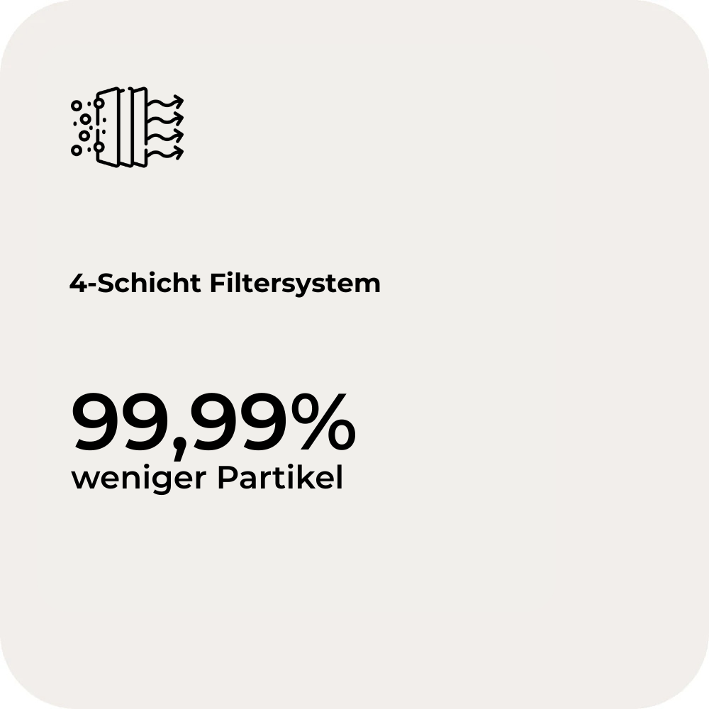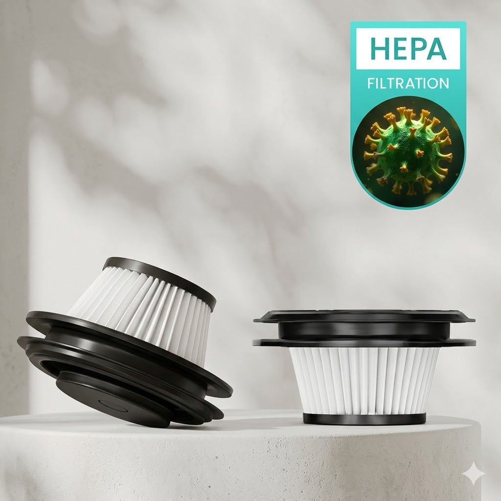 Unsere hochwertigen HEPA-Filter sorgen für saubere Luft und konstant starke Leistung. Sie halten feinste Staubpartikel, Allergene und Schmutz zuverlässig zurück - damit dein Zuhause nicht nur sauber aussieht, sondern sich auch so anfühlt.