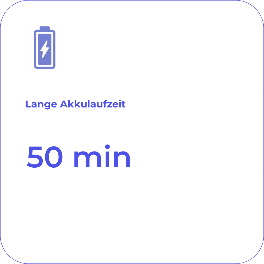 Der Akku hält bis zu 50 Minuten - genug für eine komplette Reinigung ohne Unterbrechung.